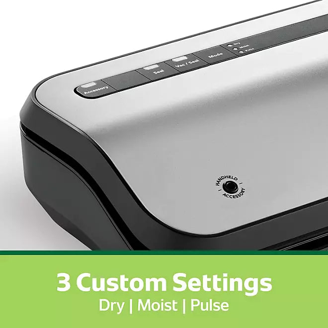 Keep food fresh up to 5x longer, than ordinary storage methods with the FoodSaver Preserve Vacuum Sealing System. This vacuum sealer machine uses innovative technologies to remove air and create an airtight seal, helping to prevent freezer burn, preserve freshness, and save you money. Choose from 3 different modes for vacuum sealing versatility: Dry or Moist mode for different food types, and Pulse mode for sealing delicate foods. This vacuum sealer features built-in roll storage and a cutter bar so you can easily create custom-size bags, while the built-in bag alignment, plus an extra wide sealing strip, perfectly positions bags to help cut down on bag waste. Two easy ways to use it: select the Vac/Seal mode to remove air and create an airtight seal, or select Seal mode to simply create an airtight seal. Connect the included accessory hose and adaptor to the accessory port, to vacuum seal with additional FoodSaver accessories. The fingerprint-resistant lid helps to keep your vacuum sealer looking like new, while the assortment of included bags and rolls allow you to start vacuum sealing right away! Stretch your grocery dollars further with a FoodSaver Vacuum Sealer, and get the most out of your food today.
